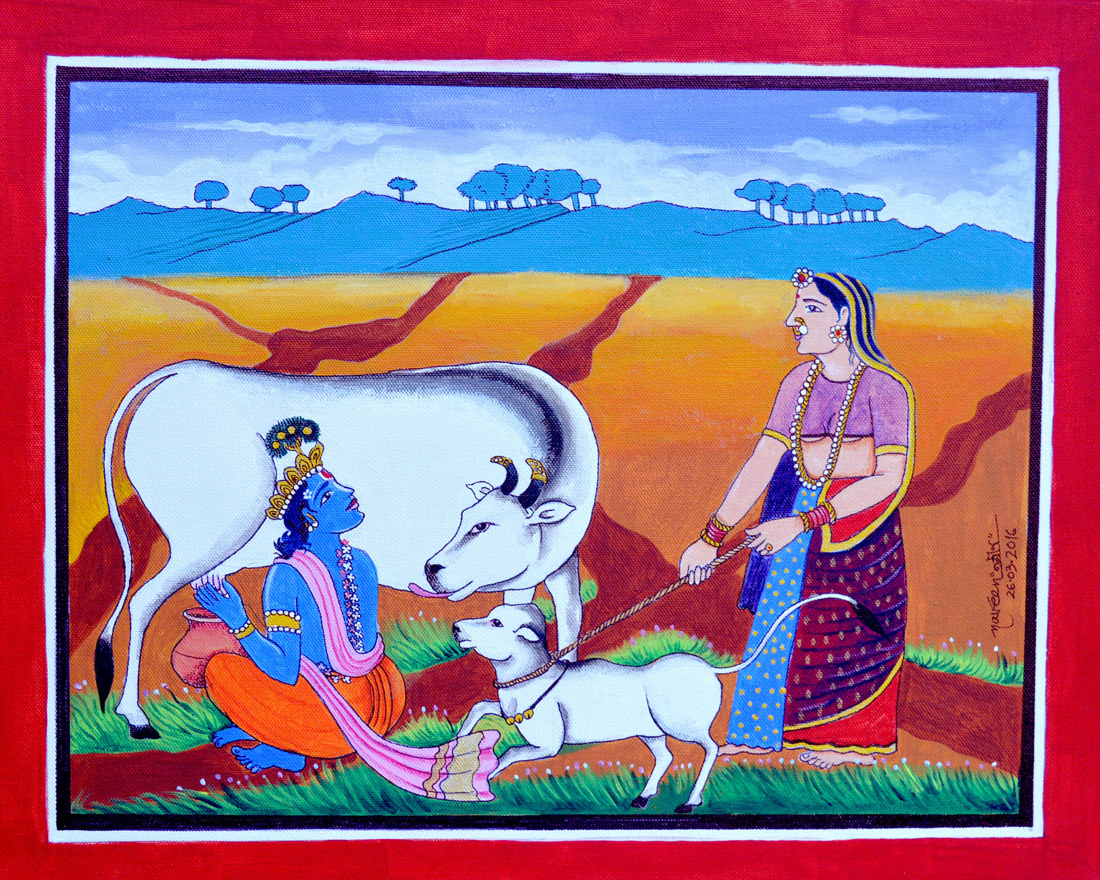In this painting Krishna taken Milk from cow.The Theme Behind this Painting is that no work is lower level every work equal importance. Krishna milking cow and Radha holding the calf & it means that without team work you cant complete any work